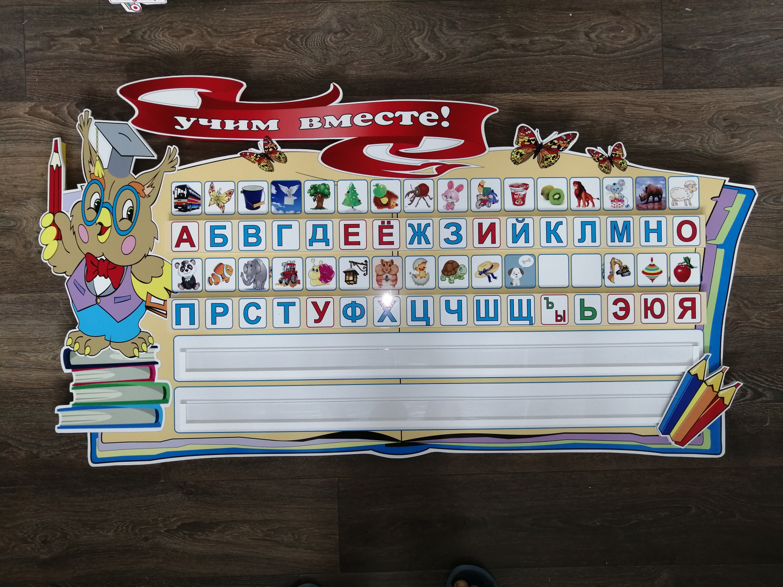 Panoul „Învățăm împreună” este conceput sub forma unei cărți deschise, decorat cu imagini atractive pentru copii. Panoul are 4 seturi de cartonașe cu alfabetul pentru a face cuvinte și propoziții. În centru este afișat alfabetul limbii române, fiecare literă fiind asociată cu o imagine sugestivă (animal, obiect, fruct etc.). Deasupra se află titlul „ALFABETIZARE” scris pe o panglică roșie. În partea stângă – o bufniță în togă stă pe un teanc de cărți, simbolizând înțelepciunea. Două rânduri goale în partea de jos oferă spațiu pentru cuvinte.