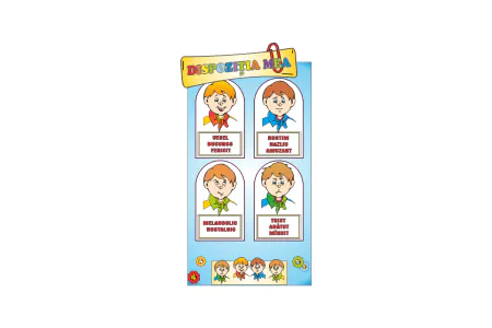 Panoul educativ „Dispoziția mea” prezintă patru emoții de bază (fericit, trist, liniștit, supărat) ilustrate prin fețe de copii. Este ideal pentru grădinițe și centre educaționale, ajutând copiii să-și recunoască și să-și exprime trăirile emoționale. Contribuie la crearea unui mediu empatic și echilibrat în colectiv.