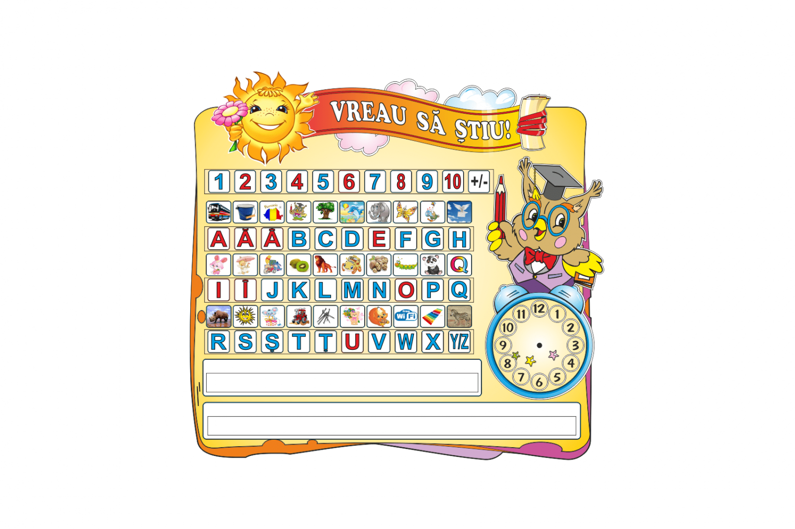Panoul educativ „Vreau să știu” îi ajută pe copii să recunoască literele, cifrele și simbolurile matematice prin imagini atractive. Include un ceas didactic și două spații libere pentru exerciții creative sau note informative. Ideal pentru grădinițe, centre educaționale și clasele primare, acest panou stimulează curiozitatea și dezvoltarea cognitivă timpurie.