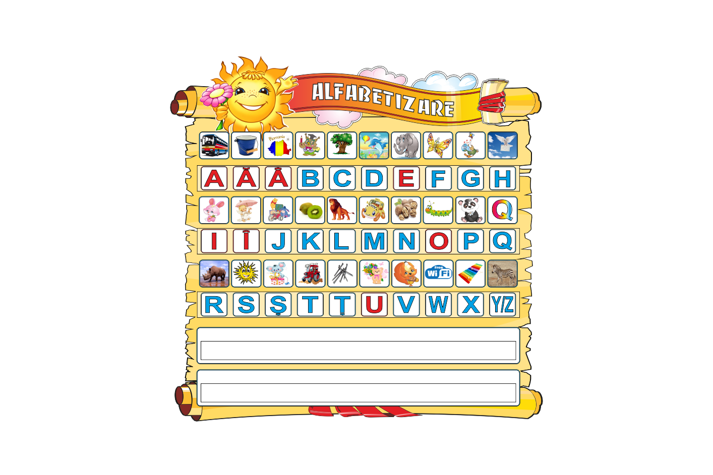 Acest panou educațional „Învățăm împreună” este ideal pentru introducerea literelor într-un mod vizual și interactiv. Fiecare literă este însoțită de o imagine reprezentativă, ceea ce ajută la memorarea ușoară a sunetelor și formarea asocierilor corecte. Perfect pentru colțuri educative, săli de clasă sau activități logopedice din grădinițe. Designul vesel cu soarele zâmbitor captează atenția copiilor și transformă învățarea într-o activitate plăcută.