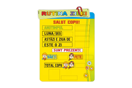 Versiunea compactă a panoului „Rutina zilei” conține toate elementele de bază necesare pentru desfășurarea activităților de început de zi în grădiniță. Include rubrici pentru: anotimp, dată, ziua săptămânii, tipul zilei, numărul băieților, fetelor și totalul copiilor. Designul simplificat este perfect pentru copiii mai mici, facilitând învățarea treptată.