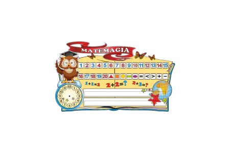 Стенд «Математика» оформлен в виде открытой книги с яркими визуальными элементами: числовым рядом от 1 до 20, геометрическими фигурами, математическими знаками и обучающими примерами. Центральным персонажем является мудрая сова, которая символизирует знания и помогает в обучении. Также стенд содержит часы с подвижными стрелками, что делает его полезным для изучения времени. Такой стенд отлично впишется в интерьер детского сада или начальной школы и превратит уроки математики в увлекательное приключение.