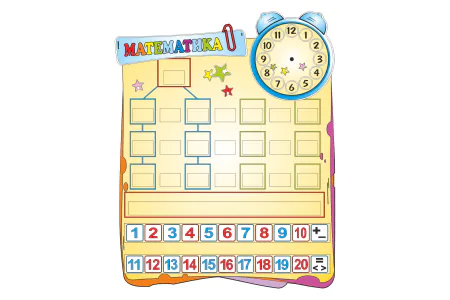 Образовательный стенд «Математика» помогает детям осваивать основы арифметики, счёта и понятий времени. Верхняя часть оформлена как будильник с подвижными стрелками — отличный инструмент для изучения часов. Ниже расположена схема для составления числовых выражений и логических задач с пустыми окошками для карточек. Снизу — числовой ряд от 1 до 20 и базовые математические знаки. Стенд способствует развитию логики, внимания и самостоятельного мышления у дошкольников и младших школьников.