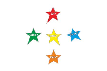 Обучающий стенд «Звёзды» представляет собой яркий набор звёздочек с вопросительными словами на румынском языке: Ce? (Что?), Cine? (Кто?), Unde? (Где?), Când? (Когда?), De ce? (Почему?). Этот визуальный инструмент помогает детям в возрасте от 3 до 7 лет осваивать базовые элементы логического анализа и построения предложений. Идеально подходит для занятий по развитию речи, мышления и устной коммуникации как в детском саду, так и на начальной ступени школы.