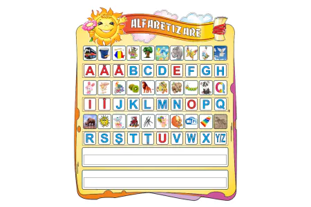 Этот стенд оформлен в виде вертикального плаката с румынским алфавитом. Каждая буква представлена в яркой рамке с иллюстрацией, начинающейся на соответствующую букву, например: B — balon, C — cal, D — delfin. Верхнюю часть украшает улыбающееся солнце с надписью ALFABETIZARE, создающее атмосферу тепла и радости. Нижняя часть содержит пустые поля, предназначенные для записи новых слов, упражнений или тематических заданий.