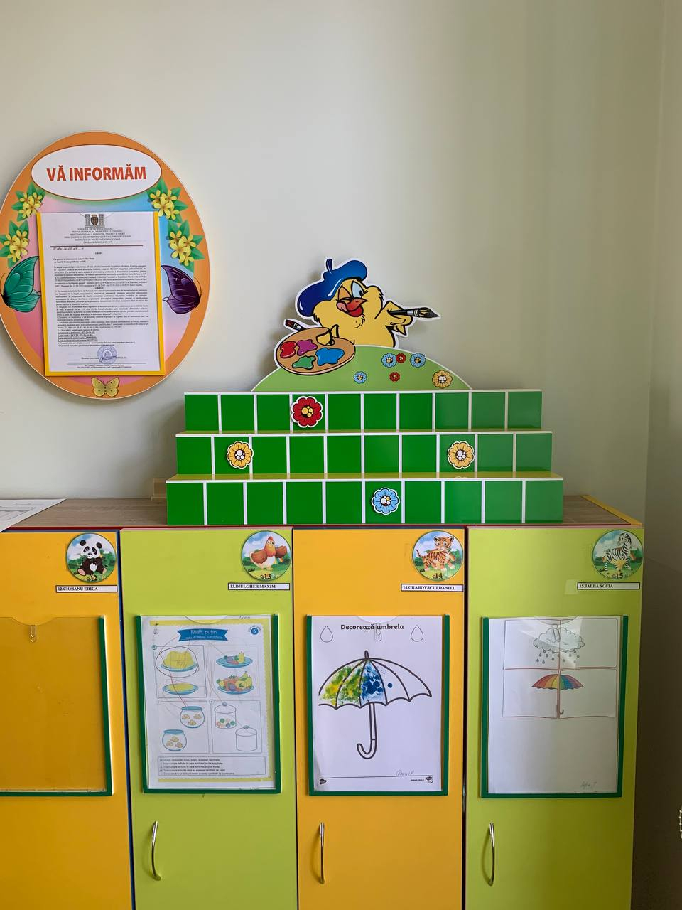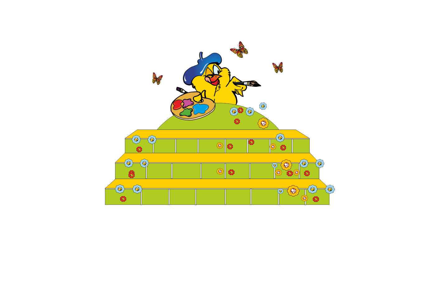 Оригинальный стенд выполнен в виде ступенчатой пирамиды с декоративными элементами — цветами, бабочками и улыбающимся цыплёнком в беретке с палитрой и кисточкой. На каждой ступени возможно размещения детских работ. Благодаря продуманной конструкции стенд позволяет организовать пространство по уровням: можно отсортировать работы по возрасту, темам или техникам. Это не только украшает интерьер, но и стимулирует творческое мышление детей.