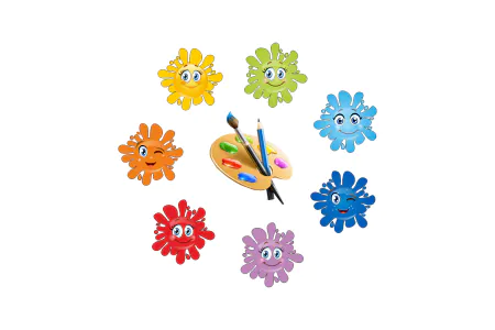 Стенд «Детское творчество» выполнен в виде палитры художника, окружённой цветными кляксами с улыбающимися лицами. Каждая клякса представляет один из основных цветов, что делает стенд не только декоративным, но и познавательным. Центральная палитра с кистями и красками символизирует творческий процесс. Такой стенд идеально подойдёт для оформления уголка искусства в детском саду или начальной школе, создавая атмосферу вдохновения и радости.