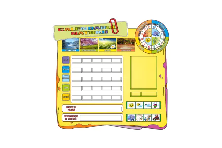 Образовательный стенд «Календарь природы» предназначен для оформления группы в детском саду и проведения утренних занятий. Яркий и функциональный, он позволяет детям отмечать текущую дату, день недели, сезон и погодные условия. Большая таблица и круг погодных символов упрощают восприятие информации, способствуют развитию наблюдательности, экологического мышления и речевых навыков. Изготовлен из плотного пластика с ламинирующим покрытием и украшен яркими иллюстрациями, которые делают процесс обучения увлекательным.