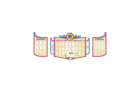 Разноформатный стенд «Визитка карта» с центральной и боковыми панелями предоставляет расширенные возможности для представления информации об учреждении. В центре — место для фотографии коллектива, логотипа и миссии. Боковые части могут содержать контакты, распорядок, достижения, педагогический состав. Идеально подходит для размещения в приёмной, холле или методическом кабинете.