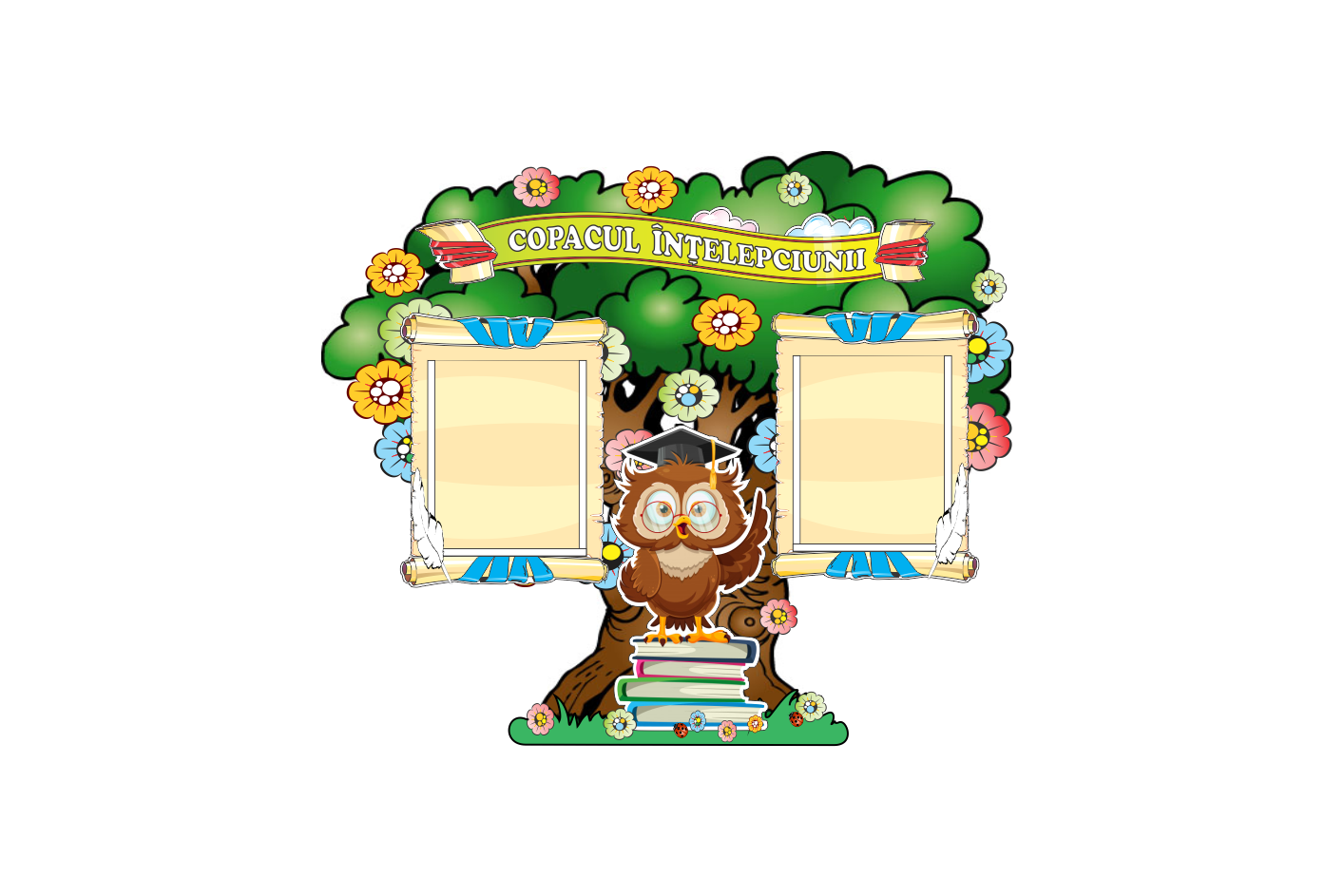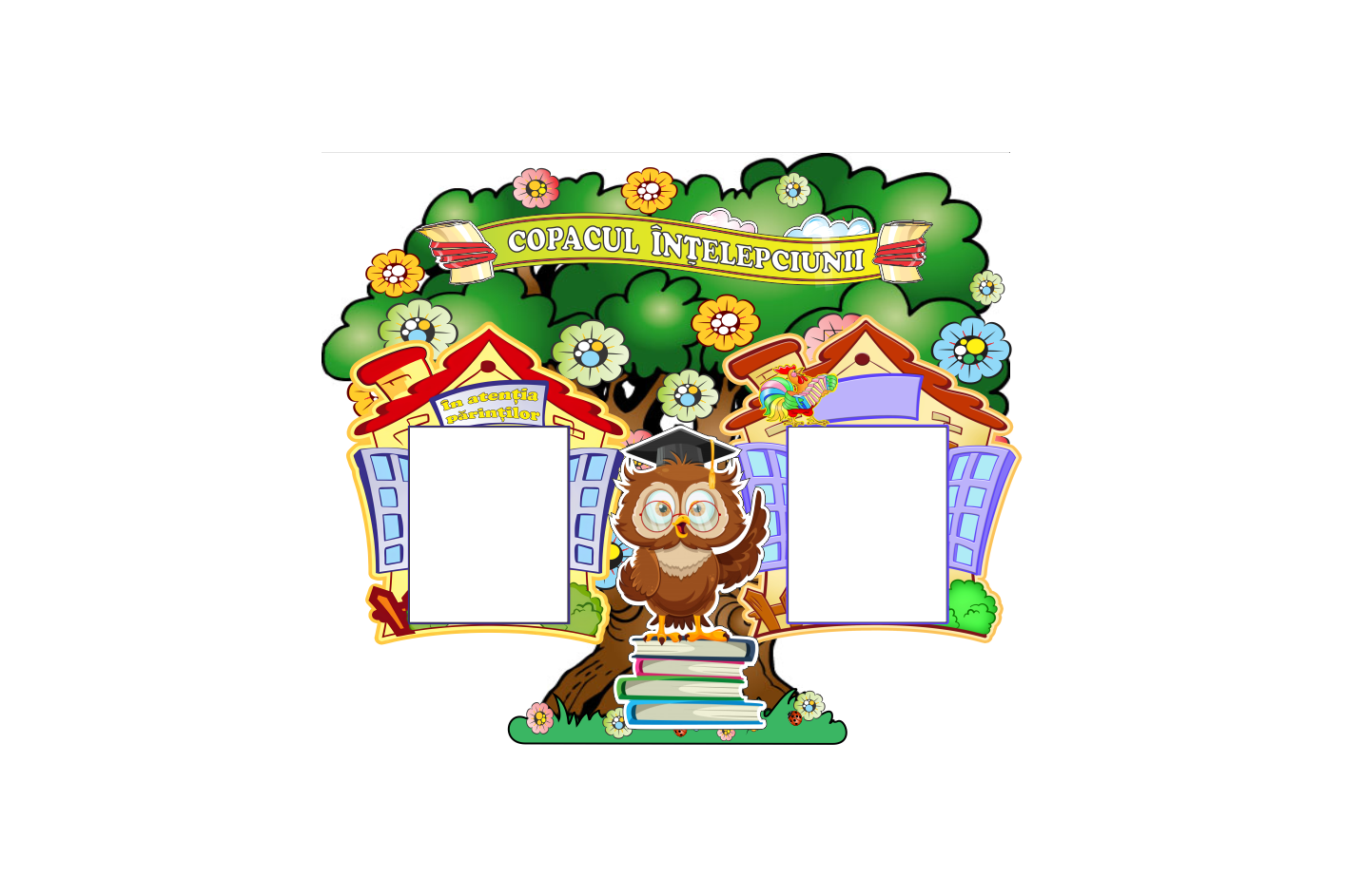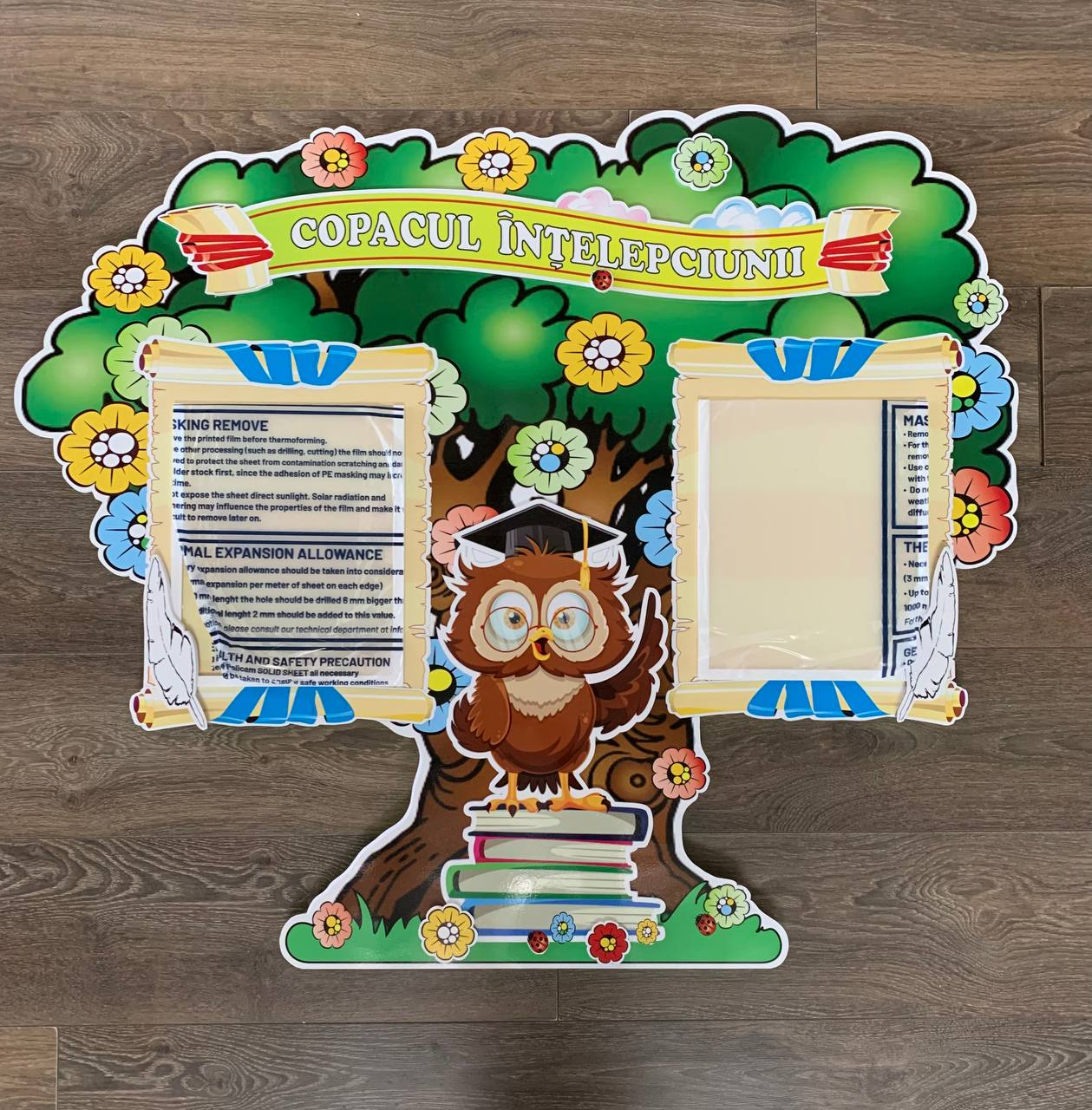 Стенд «Дерево мудрости» — это красочный и функциональный элемент оформления, предназначенный для размещения важной информации в детском саду или начальной школе. Центральное место занимает символ мудрости — сова с книгами у корней дерева, а также два «домика знаний», в которых расположены прозрачные кармашки для ежедневной информации, заданий или детских работ. Стенд оформлен в виде раскидистого дерева с цветами, книгами и надписью «Copacul Înțelepciunii» (Дерево Мудрости), что делает его не только информативным, но и эстетически привлекательным. Он способствует формированию у детей интереса к обучению и чтению.